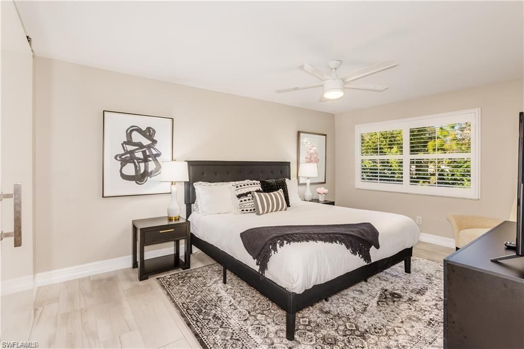 Discover this beautifully remodeled upstairs condo in the heart of Naples—an inviting retreat designed for comfort, style, and effortless living. The stunning kitchen is truly the centerpiece, featuring a marble waterfall island with bar seating, stainless steel appliances, a double oven range, soft-close cabinetry, pantry, wine rack, and fully equipped essentials that make cooking a pleasure. Ceramic tile plank flooring flows seamlessly throughout the condo and out to the lanai, enhancing the bright, open feel. The thoughtfully designed split-bedroom floor plan offers privacy and convenience. The primary suite includes a modern walk-in shower and vanity, separated by a stylish sliding barn door, along with a spacious walk-in closet that houses a stackable washer and dryer. The guest bathroom has been tastefully updated with a refreshed tub/shower and vanity. Impact-resistant sliders and windows fill the space with natural light and connect you to the outdoors. Relax on the lanai and enjoy peaceful views of the creek, where you can spot turtles basking in the sun, ducks strolling by, and even playful otters. The cozy living and dining area is complete with a fireplace and upscale furnishings—making this home truly move-in ready. Just bring your golf clubs and toothbrush. Located in a bundled golf and country club community, residents enjoy access to two recently renovated, Audubon-certified golf courses designed by Gordon Lewis: the Pines (par 70) and Palmetto (par 55). All of this is just minutes from downtown Naples, pristine beaches, and world-class shopping and dining. Your perfect Naples lifestyle starts here. Set your clock to "Beach Time"