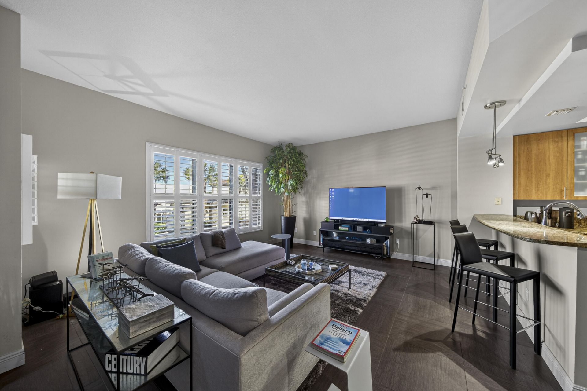 Spacious, bright and open floor plan with over 1,700 sf interior space. High ceilings, modern lighting and fixtures, upgraded flooring, plantation shutters, covered front terrace, two generous sized bedrooms with balconies, custom walk-in closet, and an upper level loft/den/tv room/office. Located on the bright side of the complex with one under building parking space and storage. Complex is gated, pet friendly, with EV charging stations, on-site management and more. Amazing pool area, community room, fitness center, media room and canal side dock. Centrally located close to beach, shopping, restaurants, downtown and vibrant Wilton Drive. Cable, internet, ammenities and all other fees included except electric. Underbuilding parking space and one outside uncovered space available.