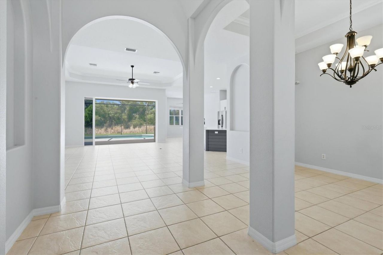 Tucked away in the peaceful and highly desirable Country Meadows community, this stunning home sits on a private half acre lot surrounded by lush greenery and offering expansive outdoor space, is perfect for entertaining, relaxing, and everyday living. From the moment you arrive, the stunning curb appeal stands out with freshly painted exterior, vibrant green lawn, and a welcoming presence. Step inside to discover a spacious open floor plan designed for both comfort and functionality. The extended living areas include a bright breakfast nook, formal dining space, and a generous living room, ideal for hosting gatherings and creating lasting holiday memories. The updated kitchen features higher end appliances, a sleek touch less faucet, and a layout that flows seamlessly into the main living areas. Recent upgrades include a newer AC system and brand new carpeting, offering peace of mind and move in ready convenience. A versatile bonus room provides endless possibilities whether you envision a home office, game room, or additional living space. Step outside to your private outdoor oasis, complete with an in ground pool and ample covered space, perfect for enjoying Florida living year round, rain or shine. An oversized garage offers plenty of room for storage, hobbies, or additional parking. Country Meadows delivers a rare combination of tranquility and convenience truly your own slice of paradise