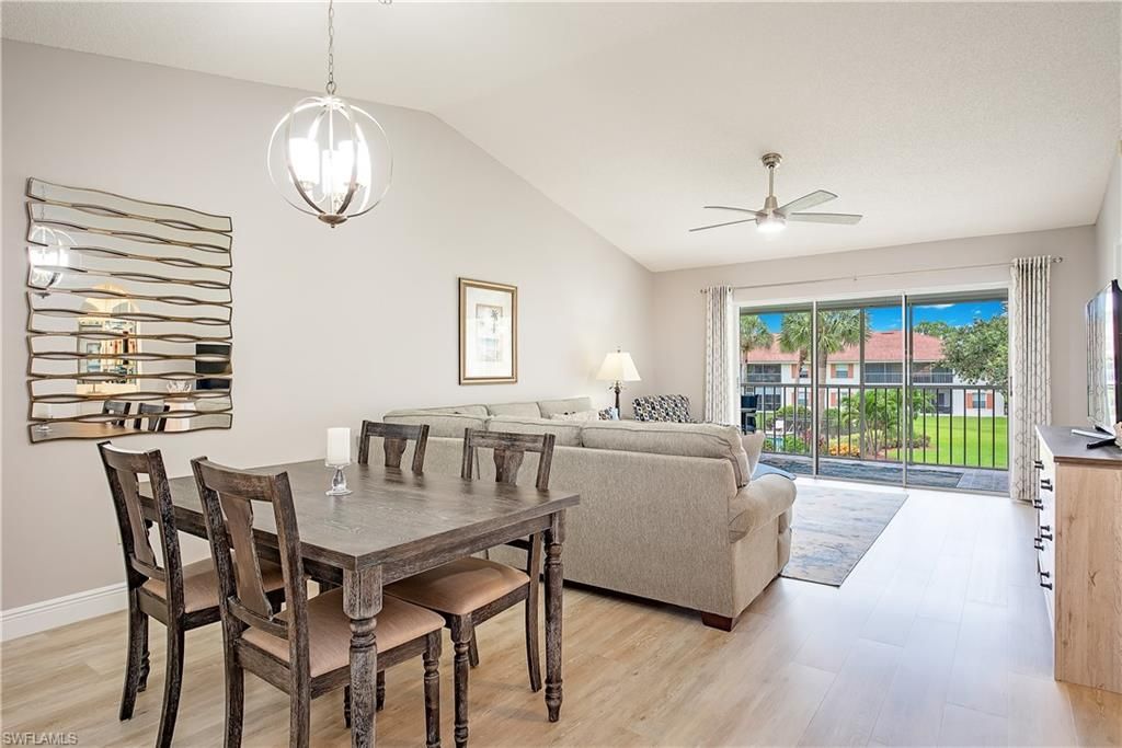 This second floor 3-bedroom 2 bath end unit being offered either furnished or unfurnished offers a large entryway, a split floor plan and vaulted ceiling in the main living area. Luxury vinyl plank flooring and 5-inch baseboards throughout installed 2022. The kitchen has quartz countertops and new appliances. The washing machine 2024, dryer 2019. A/C and water heater 2019. The interior and exterior of the unit was painted and a new roof installed in 2022. A carport is included with this unit which contains a large private storage shed. All furnishings are approximately 3 years old. The Colonies residents enjoy resort-style amenities such as two swimming pools, two pool houses with kitchenettes, two BBQ grill areas, hot tub/spa, expansive green space and direct access to the lakefront walking path. Residents also have access to the Berkshire Lakes Master Association clubhouse which is right next door and offers another swimming pool, pickleball, tennis, fitness classes and more. The Colonies is ideally located within walking distance to Publix, Walgreens, Starbucks, banks and dining. Just a short drive to downtown Naples’ beaches and world-class shopping.