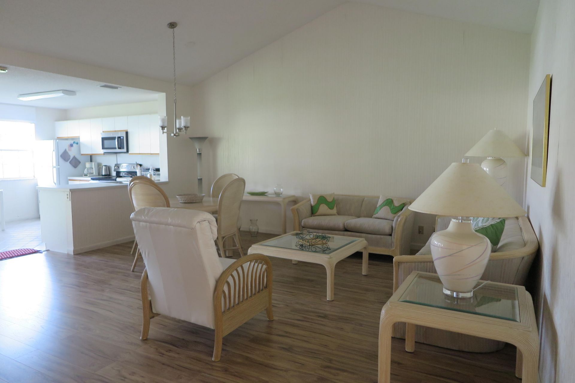 Enjoy the winter or summer season in this furnished 2 bedroom, 2 bath, second floor rental with pretty garden views. Neutral colors and furnishings throughout the apartment. New laminate floors throughout. TV in living room and master bedroom. Queen size bed in master bedroom and full size in 2nd bedroom. Screened in patio.