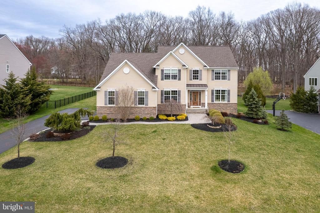 Standing on prime lot abutting wooded land, this 10-year-young Estates at Robbinsville home is full of all-day southwest sunlight, soft paint colors and airy ceilings. Hardwood floors in the nicely scaled formal rooms transition to easy-care, oversized tile in the crisp white, eat-in kitchen, where stainless steel appliances, granite countertops and a center island are ready to serve. Sliders open out to a maintenance-free deck with ample space to grill, dine and entertain under the stars. A gas fireplace draws everyone into the family room, while lots of large windows beneath a vaulted ceiling enhance the bright and breezy feel. There’s a dedicated office behind French doors in addition to the four upstairs bedrooms, all with flawless wood floors. Both the hall and primary bathrooms are designed for easy sharing with quartz-topped double vanities. Upgrades include extra-high ceilings in the semi-finished basement, presenting unlimited options for fitness, recreation and more. With every inch clean and contemporary, you can move right in and immediately enjoy the benefits of the location, less than two miles from Mercer County Park’s wide array of sports and leisure facilities, as well as Robbinsville High School.