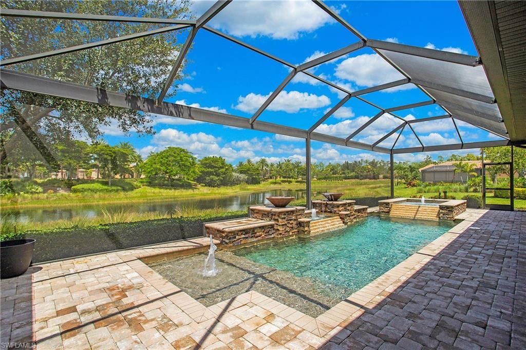 One or more photo(s) has been virtually staged, AI generated or rendered. Experience the pinnacle of Southwest Florida living in this meticulously maintained estate, situated on a premier lot with unobstructed lake views. As the largest and best priced floor plan offered in the highly sought-after Esplanade community, this residence arrives in pristine condition with freshly painted interiors and exteriors. The home’s heritage as a builder’s model is evident in every detail, from the high-end finishes to the thoughtful architectural flow that defines luxury coastal living. The journey begins with a private, sun-filled front courtyard that sets a tranquil tone before you even step inside. Thoughtfully enclosed by a solid wall and decorative fencing, this sheltered space creates a peaceful buffer from the street while serving as an inviting outdoor living area. There is ample room for a breakfast table and chairs under an umbrella, making it an ideal spot to enjoy morning coffee in the gentle sunrise light or to curate a personal garden with decorative planters and herbs. The heart of the home is an expansive, light-filled great room featuring a custom floor-to-ceiling accent wall that transitions seamlessly into the gourmet kitchen. Designed for the serious chef, the kitchen is anchored by custom cabinetry, professional-grade stainless steel appliances, and a sprawling social island equipped with a secondary prep sink. The layout provides a perfect balance of open-concept entertaining and private retreat, with a dedicated den that serves as an ideal executive home office. The master suite is a true sanctuary, finished with warm wood flooring and a spa-inspired bathroom. Storage is effortless thanks to an oversized walk-in closet outfitted with high-end custom built-ins. Each of the two additional guest bedrooms features its own private en-suite bathroom, ensuring comfort and privacy for family or visitors alike. Modern upgrades provide total peace of mind, including a high-efficiency A/C system installed in 2022 and the convenience of natural gas for the cooktop, water heater, and dryer. Outdoor living is redefined in the screened-in oasis, where brick pavers surround a heated pool and integrated spa. A newly installed panorama screen ensures your view of the lake remains entirely unobstructed, creating a tranquil backdrop for evening sunsets. Beyond the property, the Esplanade lifestyle offers world-class amenities including a resort-style pool with lap lanes, a state-of-the-art fitness center, and active pickleball and tennis courts. This exceptional location places you just minutes away from the pristine white-sand beaches and premier dining of both Naples and Marco Island.