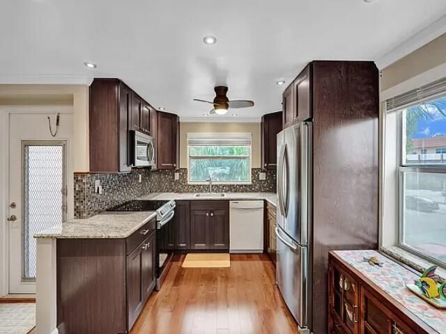 This condominium in Sunrise Lakes Phase III, Inc 2 is a Luxury unit. Sunrise Lakes Phase III contains three different types of 2 bedroom, 2 bath condominiums-a Standard unit of 850 square feet, a Deluxe unit of 1,025 square feet, and a Luxury unit of 1,146 square feet. All Luxury units are end units (with extra windows). Phase III has 3,500 condominiums. Of those, only 120 are Luxury units with the most desirable of them being on the 2nd floor (Perceived security concerns with the 1st floor and stair-climb issues with the 3rd floor). There are only 40 of these most coveted 2nd floor condominiums in all of Phase III. This unit is on the 2nd floor with a beautiful lake and golf course view! The most comprehensive renovation in Phase III was performed on thi s unit and finished in 2023. Every square inch has been touched and improved by professionals. It includes: A complete new kitchen with custom all wood soft-close cabinets featuring under-cabinet multi functional lights, stainless steel appliances, granite counter tops, and a ceramic backsplash. New electrical wiring and switches. All popcorn removed from ceilings and ceilings raised and smoothed with conduits buried inside for no visible lines to fixtures such as fans. Hardwood floors. New 6 baseboard moldings and crown moldings. New doors and door hardware. Replacement high capacity water heater. Cordless premium blinds in all windows. Top shelf, quiet ceiling fans. Contemporary modern ceramic bathrooms with new vanities, toilets, faucets, etc. Trane HVAC system with infrared sanitizing. In-ceiling LED lighting. Cable lines buried inside walls with no visible cables to TV. Impact glass on lanai. And much more... Sunrise Lakes provides amenities including the main clubhouse featuring a gym, theater/ball room, racquetball court, indoor pool, billiard room, outdoor pool, BBQ stations and more. Additionally, there are 5 satellite clubhouses, 7 pools, tennis courts, pickle ball courts, shuffleboard and a 9 hole no-fee private golf course. A word about condo dues-Included in the monthly dues, and exclusively in Inc 2, are: 200+ cable stations, super fast internet, insurance, building maintenance, home appliance and A/C repair insurance, pest control, water, inexpensive laundry facilities, and full funding of state-mandated reserves for the next 30 years. Only condominiums in Inc 2 meet all state reserve requirements. Furniture is negotiable.